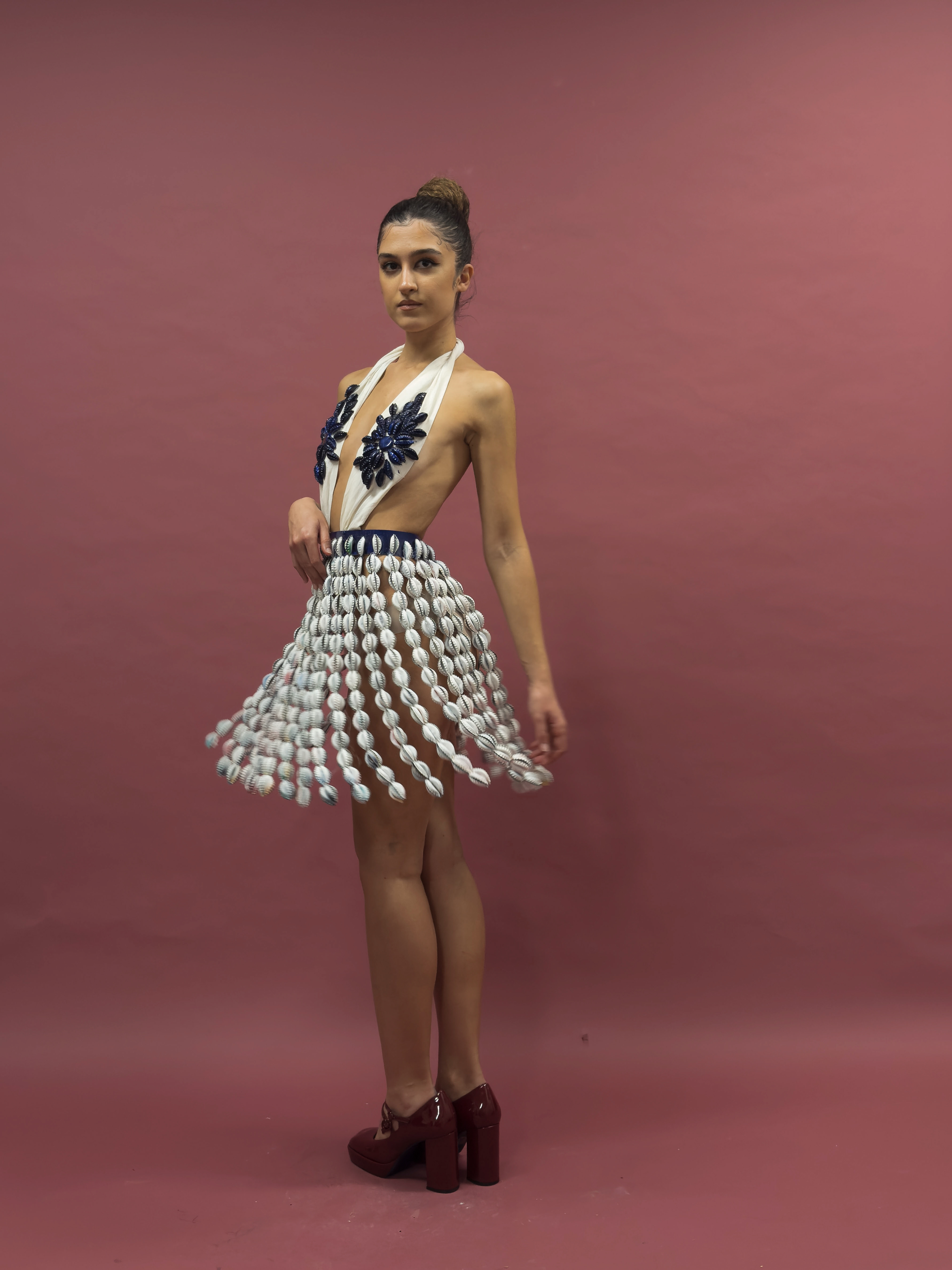 this dress, created from dark blue and white recycled bottle caps, combines simplicity with bold design. The caps are linked to form a striking pattern, with alternating colors creating a refined, mosaic effect across the entire garment. A halter neckline, featuring mostly white caps, flows into a slightly flared skirt where dark blue dominates, giving a subtle contrast. The two-tone palette adds sophistication while highlighting the intricate arrangement of each cap. The finished look is both minimalist and impactful, emphasizing sustainability with an elegant, monochromatic style.